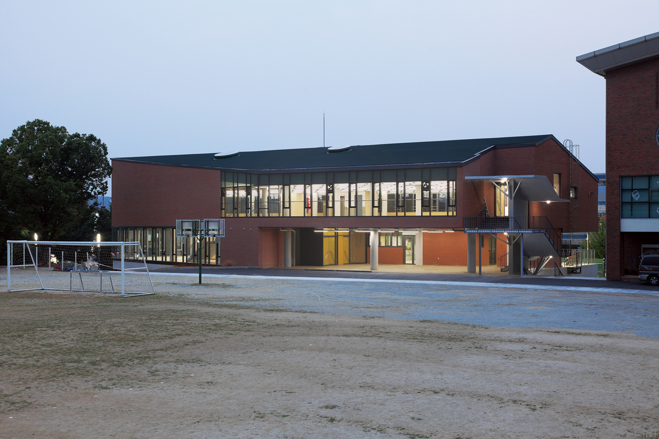 급식실의 주차장은 지하 1층에 있으며 필로티 공간으로 설계되어있고, 그 위로 2개 층이 있다. 건축면적은 940.68m2, 연면적은 2517.69m2이고. 1층은 주방, 대기 공간, 직원 식당으로 이루어져 있다. 주요 급식실은 2층에 위치해있다, 조명, 공간, 재료를 통해 학교의 정체성을 만들고자 노력하였다. 붉은 벽돌은 학교와 조화를 이루는 주요 외부 재료이며 우리는 콘크리트와 유리를 적절하게 혼합하여 사용하려고 노력했다.