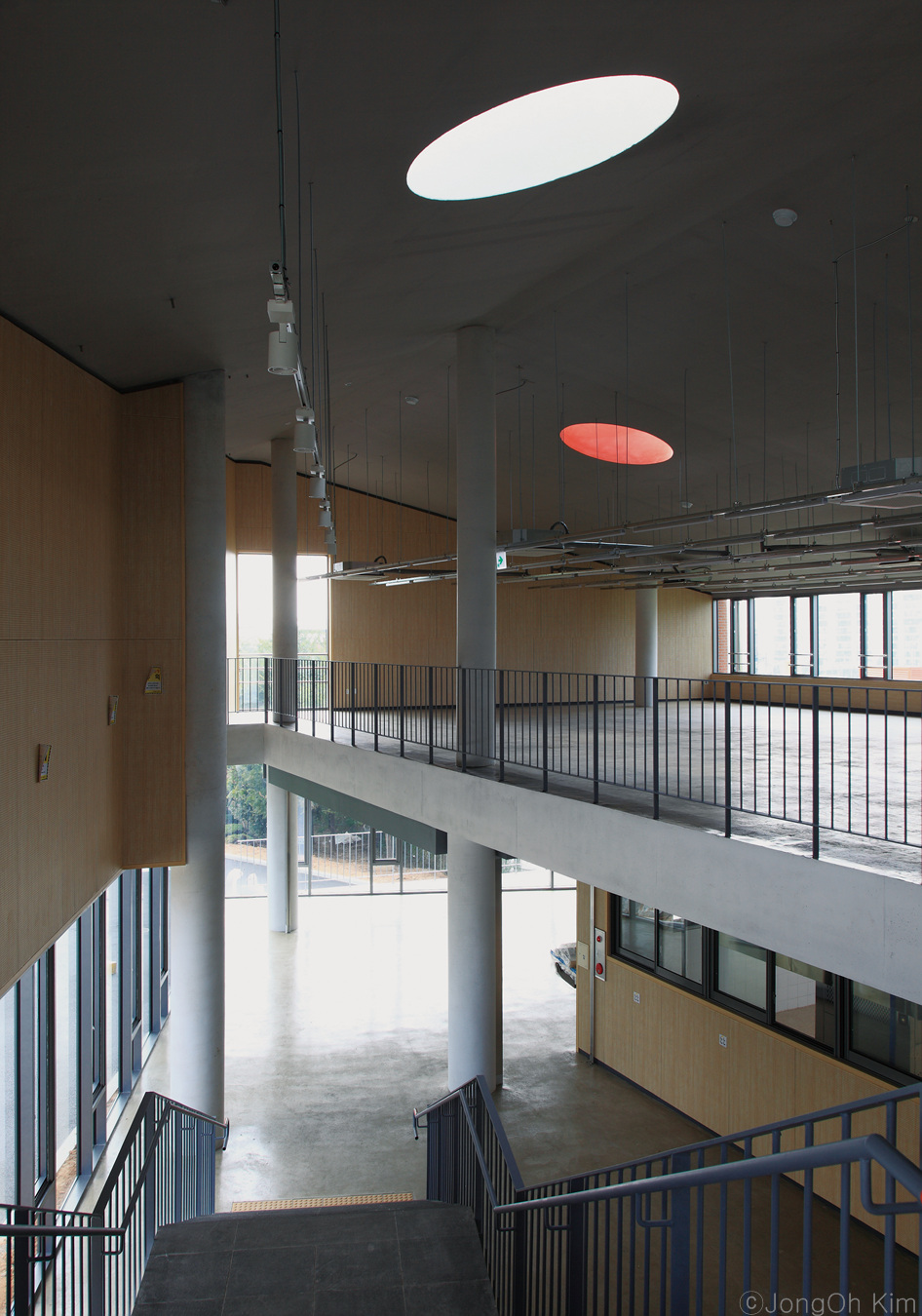가로로 긴 창들에 의해 학생들은 식사를 하는 동안 학교 주변의 풍경을 즐길수 있고 2층의 원형 채광창은 긴 공간에 리듬감을 준다. 식사를 하고 요리를 하는 공간의 주된 문제는 환기와 통풍이기에, 이 창들은 통풍과 환기가 적절히 이루어지도록 도와줄 뿐 아니라 루버를 서쪽의 긴 창문에 적용함으로써, 일몰때의 강한 빛을 완화시켜준다.
